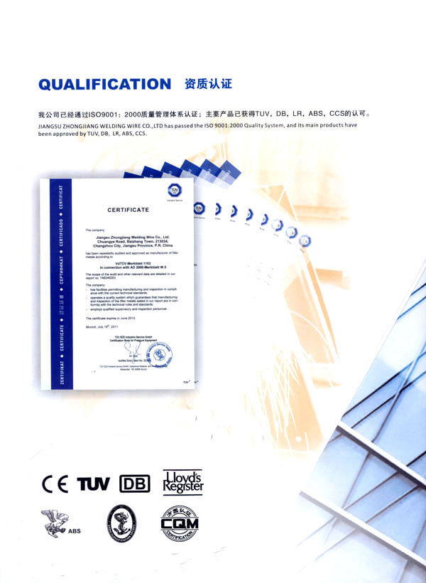 江蘇中江焊絲有限公司成立于1989年,注冊(cè)資金2188萬元,是一家專業(yè)從事氣體保護(hù)鍍銅焊絲、鋁焊絲、藥芯焊絲和埋弧焊絲的生產(chǎn)企業(yè)。 經(jīng)過近20年的不懈努力,目前企業(yè)年生產(chǎn)各類焊絲達(dá)50000余噸,產(chǎn)品不僅銷往全國(guó)各省市和地區(qū),還出口到美國(guó)、意大利、英國(guó)、法國(guó)、西班牙、波蘭、捷克、斯洛伐克、立陶宛、斯洛文尼亞、俄羅斯、烏克蘭、希臘、以色列、伊朗、南非、泰國(guó)、印尼、印度、澳大利亞等三十幾個(gè)國(guó)家和地區(qū)。 江蘇中江焊絲有限公司是通過IS09001:2000質(zhì)量管理體系認(rèn)證的企業(yè),其主要產(chǎn)品已獲得TUV,DB,LR,ABS,CCS的認(rèn)可。企業(yè)奉行“一流的產(chǎn)品,一流的信譽(yù),一流的服務(wù)”的宗旨,竭誠(chéng)為客戶服務(wù)。