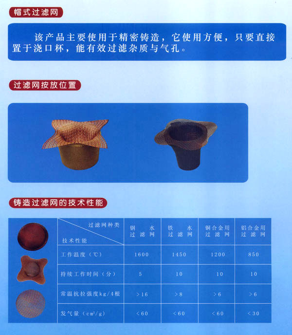 常州市猛將過濾網(wǎng)有限公司是專業(yè)生產(chǎn)系列鑄造過濾網(wǎng)的廠家。主要產(chǎn)品有:鐵水過濾網(wǎng)、鋼水過濾網(wǎng)、銅水過濾網(wǎng)、鋁水過濾網(wǎng)及熔模用帽式過濾網(wǎng)等。本廠產(chǎn)品是哈工大科研成果,榮獲國家經(jīng)委頒發(fā)的新技術(shù)成果獎。航天部科技進(jìn)步一等獎;中國質(zhì)量檢驗協(xié)會授予“猛將”牌高硅氧過濾網(wǎng)“國家權(quán)威檢測達(dá)標(biāo)產(chǎn)品”榮譽證書;我廠生產(chǎn)的“四角帽式過濾網(wǎng)”獲國家專利局外觀設(shè)計專利證書;并獲香港國際新技術(shù)新產(chǎn)品博覽會“金獎證書”。2002年獲亞洲國際新技術(shù)新產(chǎn)品博覽會“科技發(fā)明進(jìn)步獎”,2002年本廠所生產(chǎn)的“四角帽式過濾網(wǎng)在首屆“金艦杯”國際新技術(shù)成果網(wǎng)絡(luò)交易會活動中成績顯著,被評為金杯獎。同年在日內(nèi)瓦國際專利技術(shù)成果博覽會中被評為國際優(yōu)秀專利金獎。目前,本廠產(chǎn)品銷往全國各省、市、自治區(qū),是國內(nèi)銷量最大的廠家之一。同時出口韓國、泰國、東南亞等國家。進(jìn)入21世紀(jì)以來,我國加入WTO后,我廠在哈工大葉榮茂教授的指導(dǎo)下,開發(fā)研制出一種多孔泡沫陶瓷過濾網(wǎng),該產(chǎn)品兼具玻璃纖維過濾網(wǎng)和直孔過濾網(wǎng)的篩分夾渣功能,且更具有吸附微小夾渣氧化物的功能。多孔泡沫陶瓷過濾網(wǎng)的主要工作原理是讓紊亂、翻騰的(TV urbuItnt Flow)金屬液經(jīng)過產(chǎn)品形成平穩(wěn)、均勻(SmoothFlow)的金屬液,金屬液經(jīng)過復(fù)雜的多孔泡沫陶瓷過濾網(wǎng),能有效地吸附截留微小氧化夾渣物,并溢除氣泡,然后能使鑄件產(chǎn)品達(dá)到純潔度高、強度高、韌性好、機(jī)械加工性能好等特點,從而能夠降低生產(chǎn)成本,提高產(chǎn)品成品率,增加經(jīng)濟(jì)效益。我廠熱忱歡迎廣大用戶使用該產(chǎn)品。