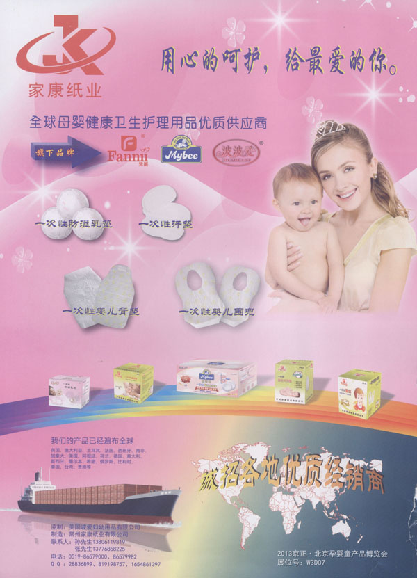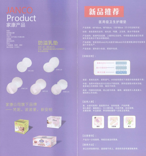 中國(guó)(JANCO)家康衛(wèi)生用品公司成立于2004年,我們專注于研發(fā)、設(shè)計(jì)、及制造健康的衛(wèi)生用品。我們的產(chǎn)品包括防溢乳墊、汗墊、寶寶背墊、圍兜、護(hù)理墊等。我們的生產(chǎn)廠房建設(shè)在中國(guó)江蘇省常州市,這是一個(gè)非常美麗的城市,并且我們的廠區(qū)鄰近沿江高速,交通非常便利。