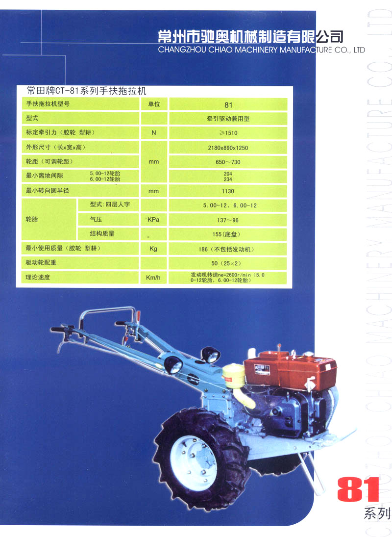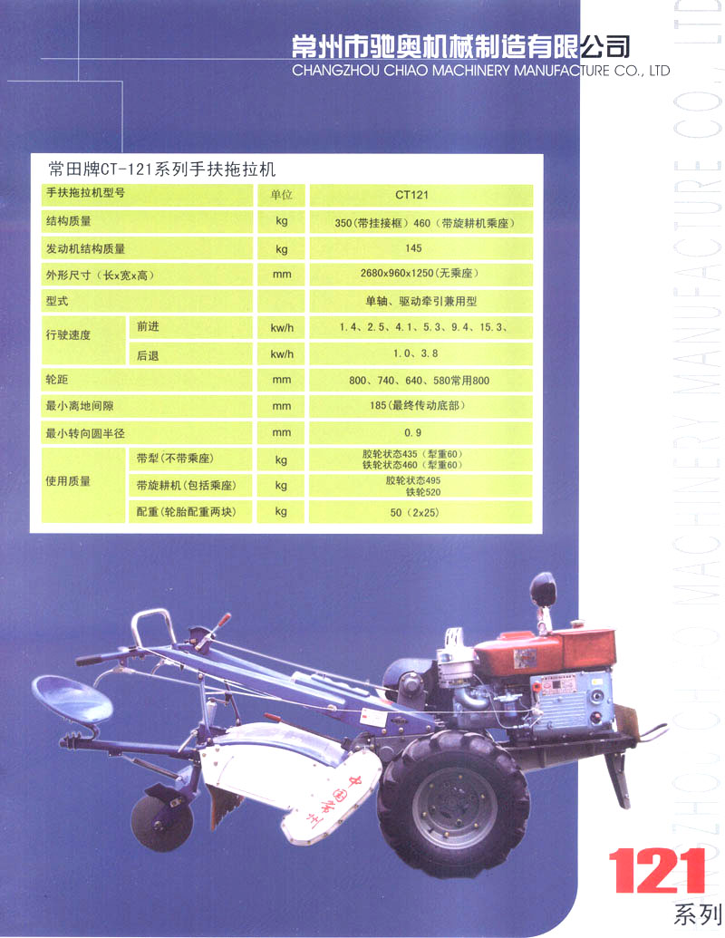 常州市馳奧機械制造有限公司是生產(chǎn)手扶拖拉機的專業(yè)生產(chǎn)企業(yè),公司位于風(fēng)景秀麗、人文薈萃的江蘇省常州市,緊鄰滬寧、寧常高速以及312國道,交通極為便利。公司擁有先進的手扶拖拉機生產(chǎn)線,主要生產(chǎn)81/91,121/151型手扶拖拉機,產(chǎn)品均為國家農(nóng)機購置補貼產(chǎn)品。 公司堅持以科技興企業(yè),在提高產(chǎn)品技術(shù)含量的同時,加強產(chǎn)品質(zhì)量、售后服務(wù)方面的監(jiān)督與管理,根據(jù)市場需求提升改進和研發(fā)新產(chǎn)品,使公司產(chǎn)品得到了市場的認可,贏得了廣大農(nóng)民用戶的一致好評。 公司將本著“誠信經(jīng)營、質(zhì)量第一、客戶至上”的經(jīng)營理念,立足現(xiàn)在、著眼未來,以打造常州一流的農(nóng)機品牌為目標,在提升產(chǎn)品技術(shù)、保障產(chǎn)品質(zhì)量的同時,不斷研發(fā)新產(chǎn)品,最大程度的滿足用戶需求,為我國農(nóng)業(yè)機械現(xiàn)代化發(fā)展做出應(yīng)有的貢獻!
