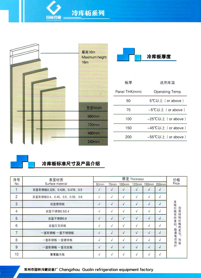 常州市國林冷藏設(shè)備廠(原武進(jìn)長虹冷藏設(shè)備廠)成立于1995年,地處江南水鄉(xiāng)中國富饒的“長江三角洲”中心區(qū)域—江蘇常州,滬寧高速、沿江高速、312國道,交通快捷,即刻到達(dá)。 國林冷庫:公司通過了ISO9001:2000質(zhì)量體系認(rèn)證,國林冷庫多次獲得“江蘇省優(yōu)質(zhì)產(chǎn)品”稱號,全國質(zhì)量服務(wù)AAAAA示范單位,并且是中國食品網(wǎng)、阿里巴巴,空調(diào)制冷誠信通會員企業(yè),并與全國多家設(shè)計院技術(shù)合作,本廠的誠信服務(wù)獲得了廣大客戶的認(rèn)可。 國林冷庫:中國制冷行業(yè)的十大冷庫制造商之一,中國制冷重要工業(yè)生產(chǎn)基地。本公司***生產(chǎn)保溫庫板及冷庫制冷成套設(shè)備,庫板材料涉及不銹鋼、彩鋼板、玻璃鋼板、保溫聚氨脂板。年產(chǎn)量3000多臺,庫板30多萬平方,歡迎新好客戶前來訂購。 國林制冷:公司始終堅持:“質(zhì)量為上,追求品質(zhì)”的生產(chǎn)方針;始終信奉:“客戶為先,服務(wù)為本”的經(jīng)營理念。我們愿同廣大的新老客戶在新的世紀(jì)里,共同發(fā)展,利益雙贏,再創(chuàng)輝煌。 常州市國林冷藏設(shè)備廠***生產(chǎn)7.5公分,10公分,12公分,15公分,20公分的聚氨酯冷庫板,面板包括彩鋼板、不銹鋼板、壓花鋁板等各種板材,各種冷庫半埋門及平移動門,各種鐵排管和鋁排管,價格優(yōu)惠,有需要的可以聯(lián)系我金文燁18761183807