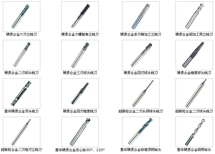 1 整體硬質(zhì)合金柄麻花鉆 2 粗柄麻花鉆 3 直柄鍵槽銑刀 4 力銑刀 5 球頭銑刀 6 鉸刀 7 鏜刀 8 定柄鉆 9 精磨元棒 10 光面塞規(guī) 11 精磨銑刀 12 鑲合金螺旋立銑刀 13 鑲合金鉸刀