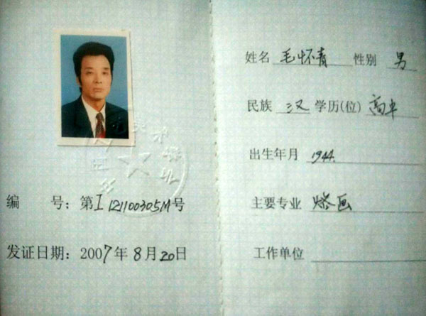 毛懷青,江蘇常州市武進人。 中國工藝美術學會會員,常州市中國烙畫研究會副會長,常州市文博鑒賞協(xié)會理事,非物質文化遺產烙畫傳承人。高級工藝美術師。 年輕時學習國畫、油畫中年蔓現掌州咯畫源遠流長、歷史悠久,有著其它美術門類不具備的藝術風格與特色。可謂是工藝美術中的一朵十分亮麗的藝術奇葩,是我民族先人給我們留下的一份不可多得十分珍貴的一份文化遺產。為弘揚與發(fā)展這份優(yōu)秀文化遺產,我從此下定決心研究烙畫,愿付出一份力量為振興烙畫事業(yè)做出貢獻。至今已潛心研究幾十年,取得了可喜的成績,被業(yè)界公認,社會關注與認可。有“江南烙畫第一筆”之美譽。 近年來,創(chuàng)作的烙畫作品分別獲得過全國、省市級的金、銀、銅獎多次。中央電視臺曾兩次播放過本人的烙畫作品,江蘇電視臺、常州電視臺也曾多次播放過本人的作品與烙畫藝術生涯,揚子晚報、常州日報、常州晚報也曾多次報導過本人的烙畫作品,出版物有三種版本都能查閱到介紹本的烙畫從藝生涯與藝術業(yè)績。