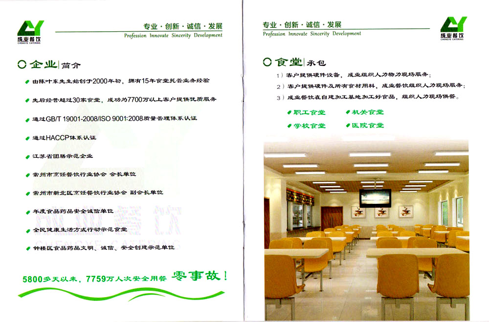 常州市成業(yè)餐飲管理有限公司位于常州市鐘樓區(qū)星港58號,是一家專業(yè)從事中小學(xué)師生營養(yǎng)餐制售及配送一體化的企業(yè),自創(chuàng)立以來,始終堅持“專業(yè)•創(chuàng)新•誠信•發(fā)展”的經(jīng)營理念,牢固樹立“消費者利益至上”的行業(yè)價值觀,以“社會利益和經(jīng)濟利益共同實現(xiàn)”為發(fā)展目標,深入推進各項創(chuàng)建工作,積極響應(yīng),工商協(xié)同、培育品牌、信息共享、完善制度、增強能力,從而更好地服務(wù)于在校就餐師生。 公司董事長陳葉東先生經(jīng)過多年的自主經(jīng)營歷程,積累經(jīng)驗,勇于創(chuàng)新,積極進取,于2009年3月籌建創(chuàng)立常州市成業(yè)餐飲管理有限公司,注冊資金518萬元整,發(fā)展至今,已經(jīng)營管理30多家中小學(xué)、企業(yè)食堂,每天為45000多人次提供優(yōu)質(zhì)放心午餐,擁有良好的經(jīng)營信譽和口碑。 為了更好的適應(yīng)常州學(xué)生營養(yǎng)餐供給模式,于2015年2月投建2000平方米中心廚房,同年8月正式投入使用,以先進的恒溫配送模式滿足校內(nèi)無食堂的學(xué)校供餐需求。2018年5月,鑒于公司發(fā)展需求,重新投建350平方米團餐加工及配送中心,8月正式投入生產(chǎn),力求成為常州市一流的學(xué)生營養(yǎng)餐配送企業(yè)。 基于常州公司的穩(wěn)步發(fā)展,成業(yè)并沒有滿足現(xiàn)狀,停下腳步。2017年7月以980萬注冊創(chuàng)建鹽城成業(yè)餐飲管理有限公司,為鹽城阜寧教育體系各單位提供食堂管理及師生團膳配送服務(wù)。至2019年3月,日供餐人次已達21000多人次。 2018年7月,成業(yè)餐飲在鹽城地區(qū)相繼啟動濱海和響水兩縣的集體用餐配送及食品原料大宗采購項目,當?shù)叵嚓P(guān)政府部門對公司的發(fā)展規(guī)劃及實施進度給予了高度評價和支持。