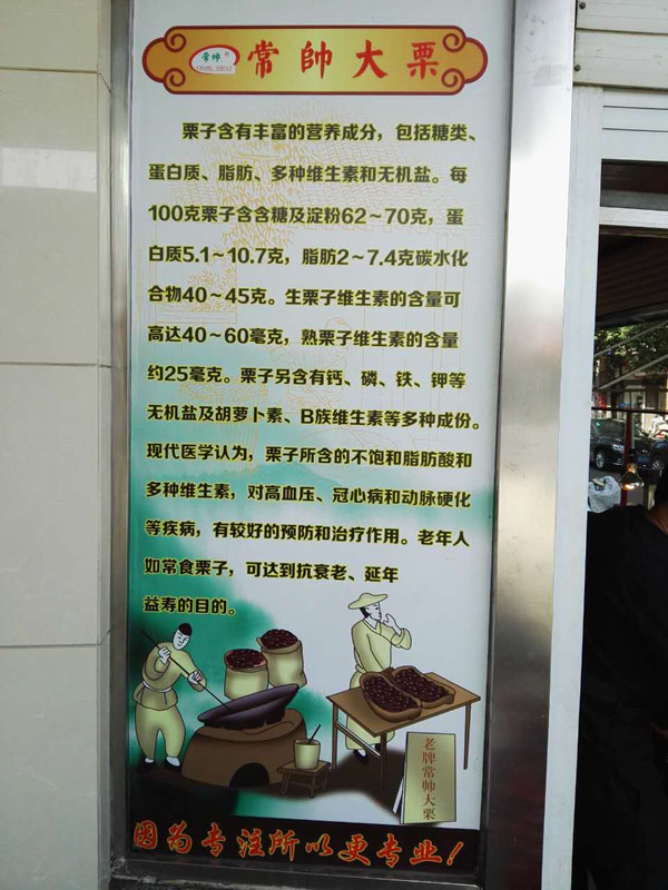 在熱鬧的懷德中路花園菜市場口有一家開了二十幾年老字號店,店面不大,但應該是花園地區(qū)味道最好的大栗了,這就是常帥大栗。他家的大栗又香又糯,熱的時候殼很好撥,沒有一粒是壞的,一股令人迷醉的香味飄送到四面八方,這股甜蜜的滋味便是獨屬于糖炒栗子的味道。瑟瑟寒風中,抱一抱溫香的糖炒栗子,輕咬一口金黃的栗子肉,香甜軟糯的滋味從舌尖直抵心頭。是每一個愛吃甜食的人難以抗拒的享受。常帥大栗除總店外,另外又增設了五家分店分布在常武地區(qū)各鄉(xiāng)鎮(zhèn)。深受廣大消費者歡迎。