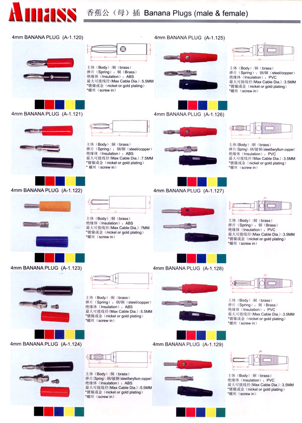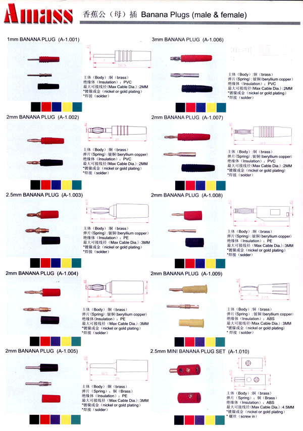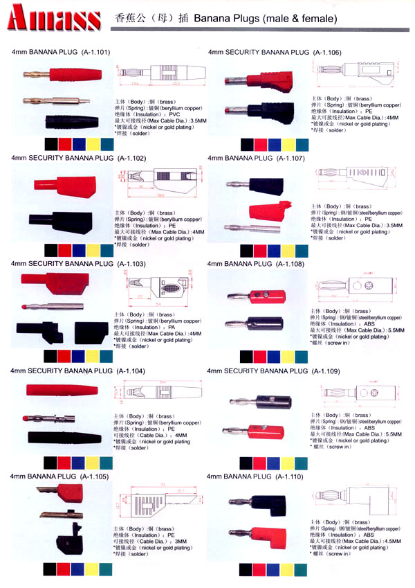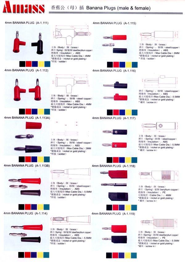 本公司專業(yè)生產(chǎn)各類香蕉插頭,香蕉插座,接線柱,電瓶夾,鱷魚夾,測試導線,測試筆等。產(chǎn)品分2mm/2.5mm/3mm/3.5mm/4mm五大系列,百余種款式, 各種香蕉插廣泛用于儀器、儀表、電力測試、教學、玩具,視聽設(shè)備、醫(yī)療儀器,保健產(chǎn)品等領(lǐng)域。公司技術(shù)力量雄厚,生產(chǎn)工藝先進,產(chǎn)品遠銷港、臺、歐美,并與飛利浦等國際品牌配套。公司本著精益求精的理念,歡迎新老客戶光臨。