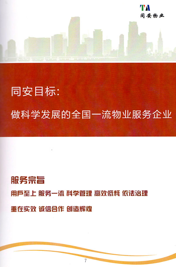 公司始終以“打造中國(guó)最值得信賴和最值得尊重的物業(yè)管理服務(wù)集成商”為愿景自我鞭策,不斷前行。同安物業(yè)以客戶滿意為終極目標(biāo),不斷加強(qiáng)”崗位資格認(rèn)證能力,人才招聘與職業(yè)化培訓(xùn)能力,產(chǎn)品策劃與管理設(shè)計(jì)能力,品質(zhì)監(jiān)督與管控能力,技術(shù)更新與運(yùn)營(yíng)優(yōu)化力“五大專業(yè)能力的培養(yǎng)和提升,實(shí)現(xiàn)“精品化管理,專業(yè)化服務(wù)”。