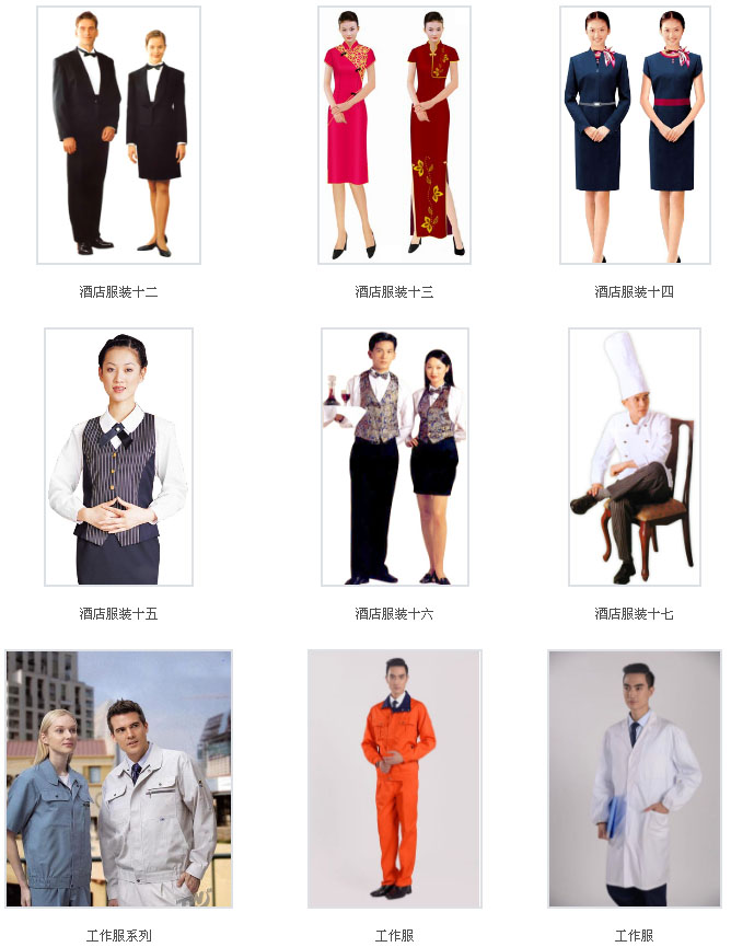 目前本公司專業(yè)生產(chǎn)的品種主要有:工作服裝、牛仔工作服、西服、酒店賓館(餐飲)服裝、校服、醫(yī)務(wù)、保安、美容、美發(fā)、按摩、超市團(tuán)體服裝等。