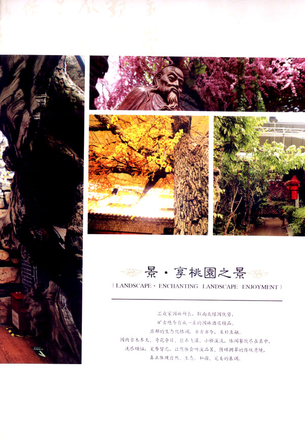 淹城花都溫泉水城孕育天地之精華,悅身、悅?cè)荨傂、悅神。置身其中泉水潺潺,霧氣繚繞、花瓣飄香,恍若仙境!稗渌略谑,弄花香滿衣”,花都溫泉的浪漫與溫潤在這里完美展現(xiàn)。 花都溫泉水城包括洗浴區(qū)、戲水世界、露天溫泉、自助餐廳、生態(tài)房、別墅區(qū)、紅文化房、VIP區(qū)等多種功能區(qū)域,是集溫泉養(yǎng)生、休閑住宿、演藝會(huì)務(wù)為—體的休閑度假勝地,給賓客帶來江南小鎮(zhèn)的浪漫水城之旅。 古木新枝畔賓客對(duì)酒當(dāng)歌,溪泉石椅旁把茶品啜。 淹城-三勤生態(tài)酒店,這里是一處綠色生態(tài)的美食家園。此地鬼斧神工.奇水異石,和風(fēng)細(xì)雨林中穿過,引百鳥朝來暮歌;這里集生態(tài)餐飲、演藝、中小型會(huì)務(wù)為一體,將現(xiàn)代裝飾風(fēng)格和古雅拙樸的自然裝修完美整合;這里聚集大江南北名廚,推出精致綠色美昧佳肴。來到這里,賓客可享田園至美之景,品舌尖至鮮之味,實(shí)乃人生一大樂事。