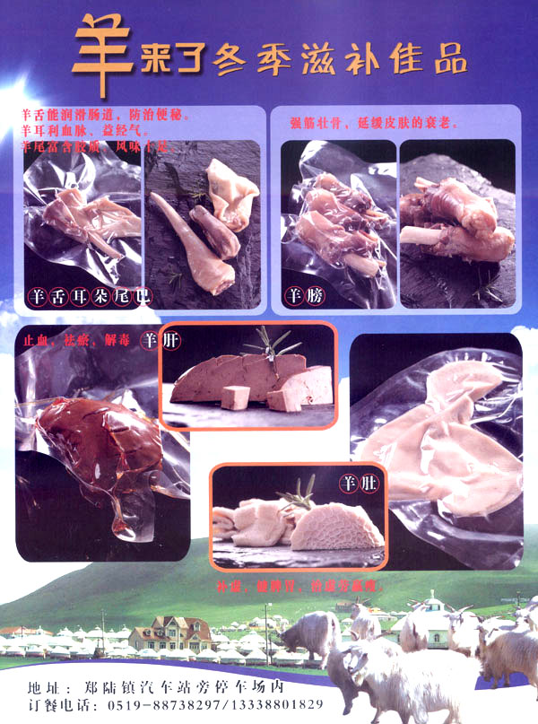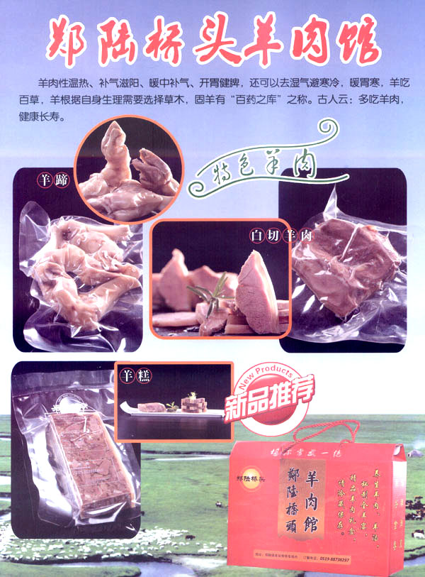 鄭陸橋頭羊肉館主要從事羊肉、羊肉制品的加工。羊肉性溫?zé)、補(bǔ)氣滋陽、暖中補(bǔ)氣、開胃健脾、還可以去濕氣避寒冷,暖胃寒、養(yǎng)吃百草、養(yǎng)根據(jù)自身生理需要選擇草木、固羊有“百藥之庫”之稱。古人云:多吃羊肉、健康長(zhǎng)壽。