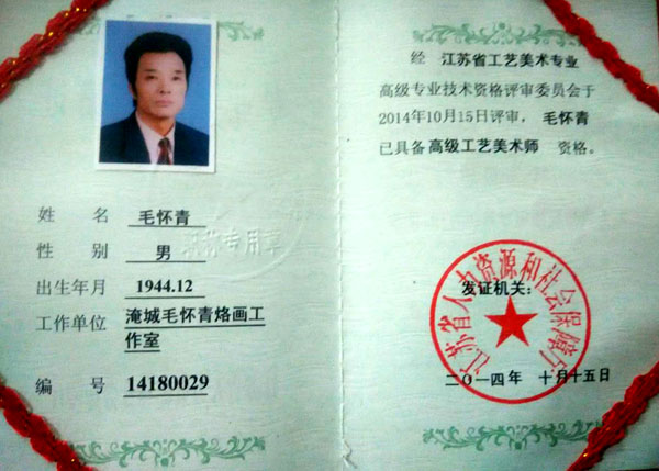 中國(guó)工藝美術(shù)學(xué)會(huì)會(huì)員,常州市中國(guó)烙畫(huà)研究會(huì)副會(huì)長(zhǎng),常州市文博鑒賞協(xié)會(huì)理事,非物質(zhì)文化遺產(chǎn)烙畫(huà)傳承人。高級(jí)工藝美術(shù)師。