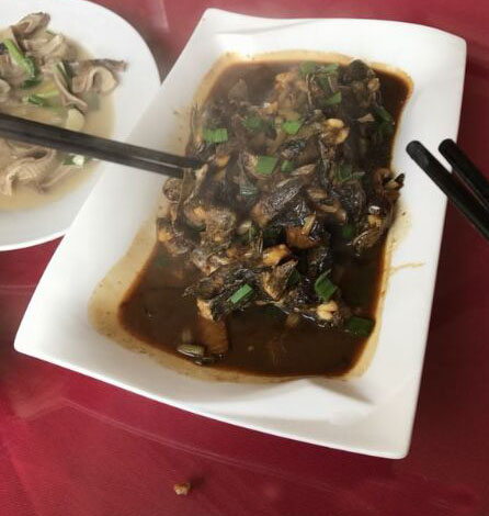 菜肴介紹:以滆湖小刀魚為新鮮的原材料,佐以自家的配料,在油鍋中煎炸而成。炸得金燦燦的小刀魚上,撒上把新鮮的香菜末,看著就讓人流口水。 菜肴介紹:當(dāng)天的農(nóng)家菜評(píng)比中,以豬蹄為主題的農(nóng)家菜有好幾道,可只有這道慶蘭豬爪,獲得了評(píng)委們的一致青睞。色澤鮮亮,熬得入味,吃完后口中有回味。當(dāng)天的比賽中,評(píng)委還“嫌”慶蘭樓送來(lái)參評(píng)的豬蹄太少了,七八個(gè)評(píng)委都不夠吃。 “下婆魚本來(lái)叫下坡魚,大家吃了都覺(jué)得好,一傳十十傳百地就給叫走了音,變成下婆了!鼻弭贼缘臏韬,一網(wǎng)撈出千百條鮮靈靈的小魚兒。新鮮干凈的小 炸得酥脆,就是一道最好的下酒或是下粥菜。揣在兜里當(dāng) 也很不錯(cuò)呀,嘎嘣咬著,極松脆極鮮美的,魚刺也都炸酥啦,無(wú)論是老人還是年輕人、小孩都能吃。 除了漏湖里的魚,嘉澤的鵝、雞、鴨等家禽也遠(yuǎn)近聞名。也是因?yàn)樯鷳B(tài)環(huán)境好的緣故,一群學(xué)農(nóng)的博士在這里開起了大水牛市民農(nóng)園,主打的就是有機(jī)食材。