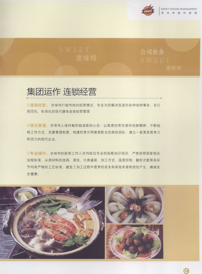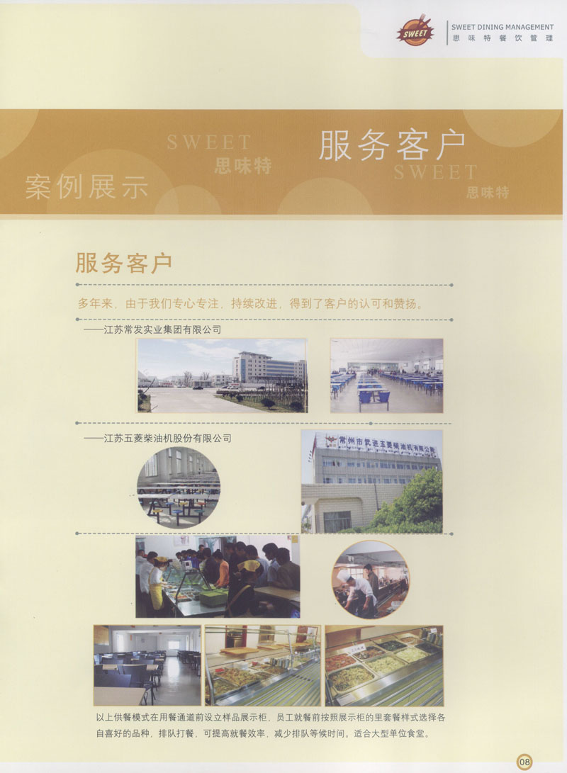 常州市思味特餐飲有限公司是一家專業(yè)從事企事業(yè)后勤服務(wù)的有限責任公司,公司從承包食堂起步,逐漸發(fā)展為經(jīng)營團膳承包、營養(yǎng)送餐、生活區(qū)管理、連鎖餐廳的綜合型企業(yè)。2008年公司斥資100萬元,在常州興建了可以同時提供3000餐膳食的中央廚房,重點打造“和美客”后勤服務(wù)品牌,全力為企事業(yè)單位解決后勤后顧之憂。 到目前為止,我們合作成功的企事業(yè)單位超過50多家,服務(wù)人數(shù)突破15萬,合作單位包括國家機關(guān)、國有企業(yè)、三資企業(yè)、民營企業(yè)、學校、醫(yī)院等,其中不乏國際知名品牌公司。 和美客愿為更多的國內(nèi)外企事業(yè)單位及機關(guān)團體分憂解難,從廚房設(shè)計、菜品配送、團膳承包、到生活區(qū)管理等提供全方位的服務(wù)。
