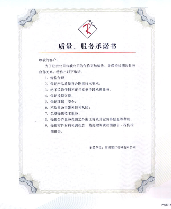 聚仁重效率更重質(zhì)量;在聚仁,寧缺毋濫的精品意識是每個員工的責(zé)任,制造精良產(chǎn)品是每個員工永遠(yuǎn)的追求。聚仁立求做到要效率,更要質(zhì)量,除了品質(zhì)一流的產(chǎn)品外,其它產(chǎn)品絕不交付客戶。聚仁重現(xiàn)場更重市場:市場決定現(xiàn)場,現(xiàn)場連著市場,現(xiàn)場為市場服務(wù),在搞好現(xiàn)場管理的同時,實現(xiàn)與市場和客戶的雙贏。聚仁對客戶的承諾是:不合格的材料不進廠,不合格的半成品不轉(zhuǎn)序,不合格的產(chǎn)品不交付,以百分之百的合格品交付客戶。