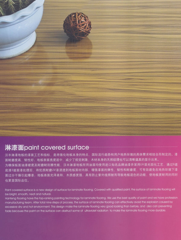 常州漢豐裝飾材料有限公司是一家涉及強(qiáng)化地板制造、屏風(fēng)鋁材生產(chǎn)、進(jìn)出口貿(mào)易的大型公司。2001年公司投入重資.全面引進(jìn)世界頂級一體化自動(dòng)流水生產(chǎn)線和具有國際先進(jìn)水準(zhǔn)的德國權(quán)威木地板生產(chǎn)技術(shù),興建強(qiáng)化地板生產(chǎn)基地。多年以來.一直不斷加強(qiáng)生產(chǎn)設(shè)備、廠房基礎(chǔ)投入,目前公司年生產(chǎn)強(qiáng)化地板能力已經(jīng)達(dá)到了500萬平方米,步入國內(nèi)一流行列,具備了雄厚的國際競爭力。 漢豐地板以奉獻(xiàn)生活中最完美的地板為發(fā)展目標(biāo),時(shí)尚流行的設(shè)計(jì)風(fēng)格和多樣化的產(chǎn)品類型,贏得了市場的廣泛贊譽(yù)和肯定。產(chǎn)品嚴(yán)格按照歐洲標(biāo)準(zhǔn)檢測強(qiáng)化木地板的各項(xiàng)性能指標(biāo).達(dá)到百分百的國際技術(shù)標(biāo)準(zhǔn),確保了每一塊地板都有著上乘品質(zhì),是綠色環(huán)保的好地板。并先后通過了Isc)9001國際質(zhì)量管理體系認(rèn)證,IS014001國際環(huán)境管理體系認(rèn)證.中國環(huán)境標(biāo)志產(chǎn)品認(rèn)證,深得用戶的一致好評,是寫字樓、商場、大型超市、學(xué)校、建筑樓宇、娛樂場所、家用私宅等鋪裝的首選地板。