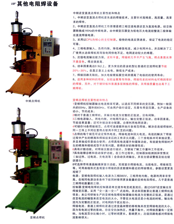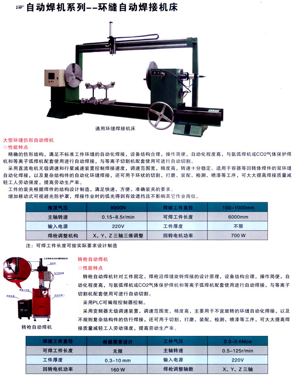 焊割主要產(chǎn)品有:點(diǎn)焊機(jī)系列、縫焊機(jī)系列、環(huán)縫焊接機(jī)床、凸焊機(jī)、排焊機(jī)、儲(chǔ)能焊機(jī)、對(duì)焊機(jī)、龍門焊機(jī)、太陽(yáng)能焊接設(shè)備和機(jī)器人焊接系統(tǒng)及外圍設(shè)備等;并為用戶設(shè)計(jì)制造專用焊接設(shè)備。