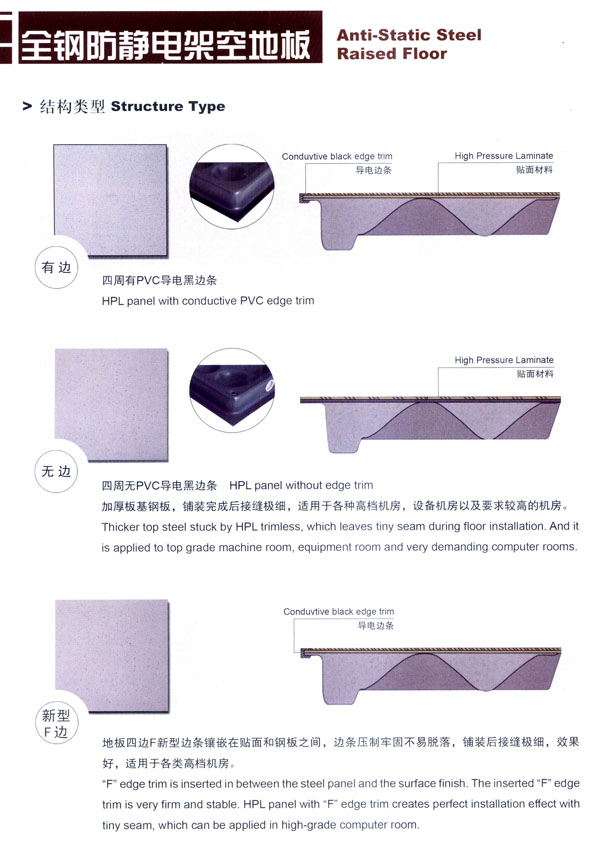 常州市蘇杰機房地板有限公司是高架地板專業(yè)制造商,專業(yè)從事防靜電地板、OA網(wǎng)絡(luò)地板等各種系列高架地板的研發(fā)、制造和銷售,并提供各種機房地面和智能化辦公區(qū)地面的整體解決方案。 公司廠區(qū)面積30000平方米,擁有全鋼地板生產(chǎn)線兩條,木基、硫酸鈣基地板生產(chǎn)線各一條,年綜合產(chǎn)能100萬平方米。生產(chǎn)蘇杰牌防靜電地板系列和蘇杰牌網(wǎng)絡(luò)地板系列,主要產(chǎn)品有全鋼防靜電架空地板、全鋼OA網(wǎng)絡(luò)地板、瓷磚貼面防靜電地板、硫酸鈣防靜電地板、木基防靜電地板、鋁合金防靜電地板、防靜電通風(fēng)地板等。 蘇杰人秉承“科技先導(dǎo)、市場為本、持續(xù)發(fā)展”的企業(yè)發(fā)展觀,堅持“以先進技術(shù)裝備為基礎(chǔ),以現(xiàn)代化管理為依托,以專業(yè)化服務(wù)為保障”的宗旨,使公司不斷發(fā)展壯大成為現(xiàn)代化的企業(yè)。 蘇杰人堅持“嚴(yán)謹思考、嚴(yán)密操作、嚴(yán)格檢查、嚴(yán)肅驗證”的品質(zhì)理念和“以客戶為中心”的服務(wù)理念,始終致力于產(chǎn)品的技術(shù)創(chuàng)新和質(zhì)量創(chuàng)優(yōu),為用戶提供優(yōu)質(zhì)的產(chǎn)品、合理的價格和貼心的服務(wù)。 常州市蘇杰機房地板有限公司將不斷開發(fā)和制造一流的產(chǎn)品,吸引和培養(yǎng)一流的人才,提供和完善一流的服務(wù),樹立和保持一流的形象,與時俱進,共謀發(fā)展。