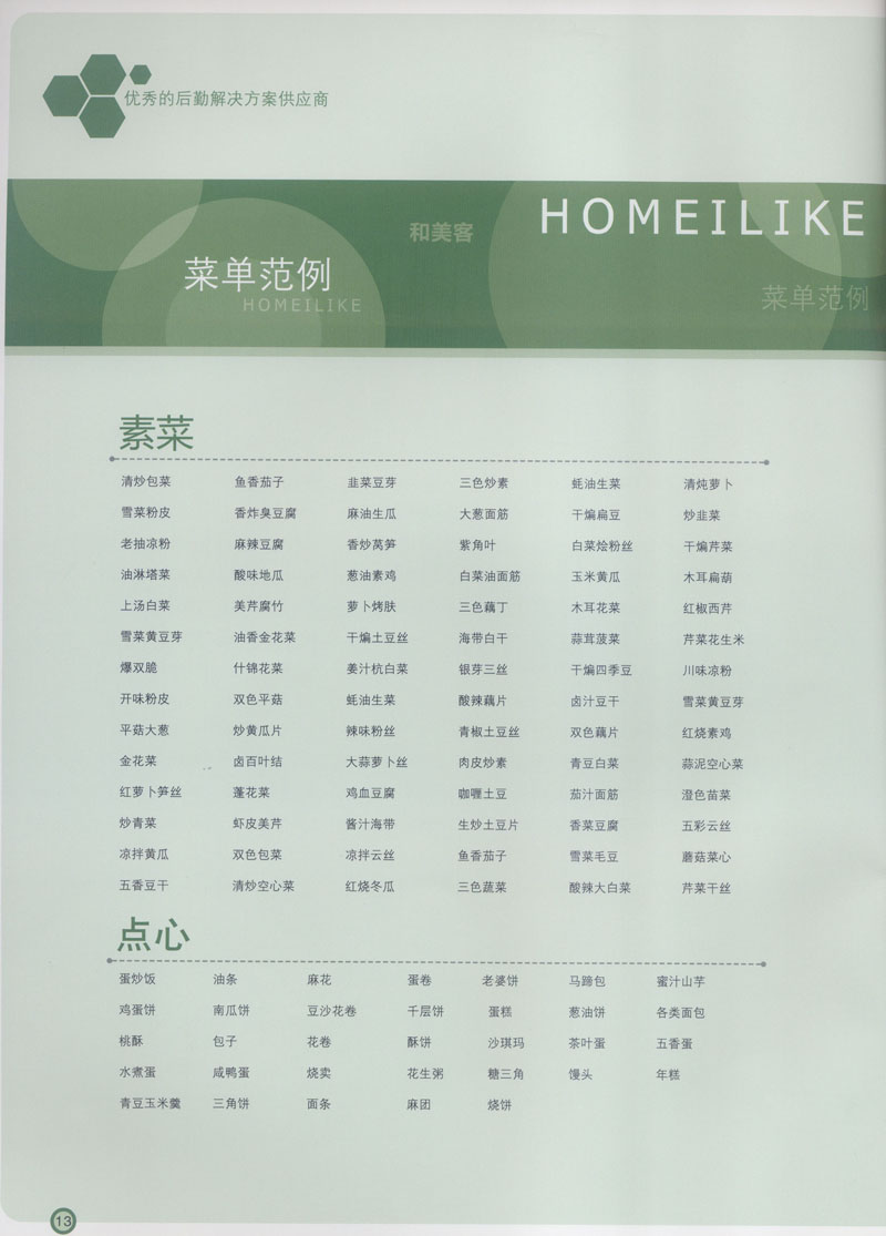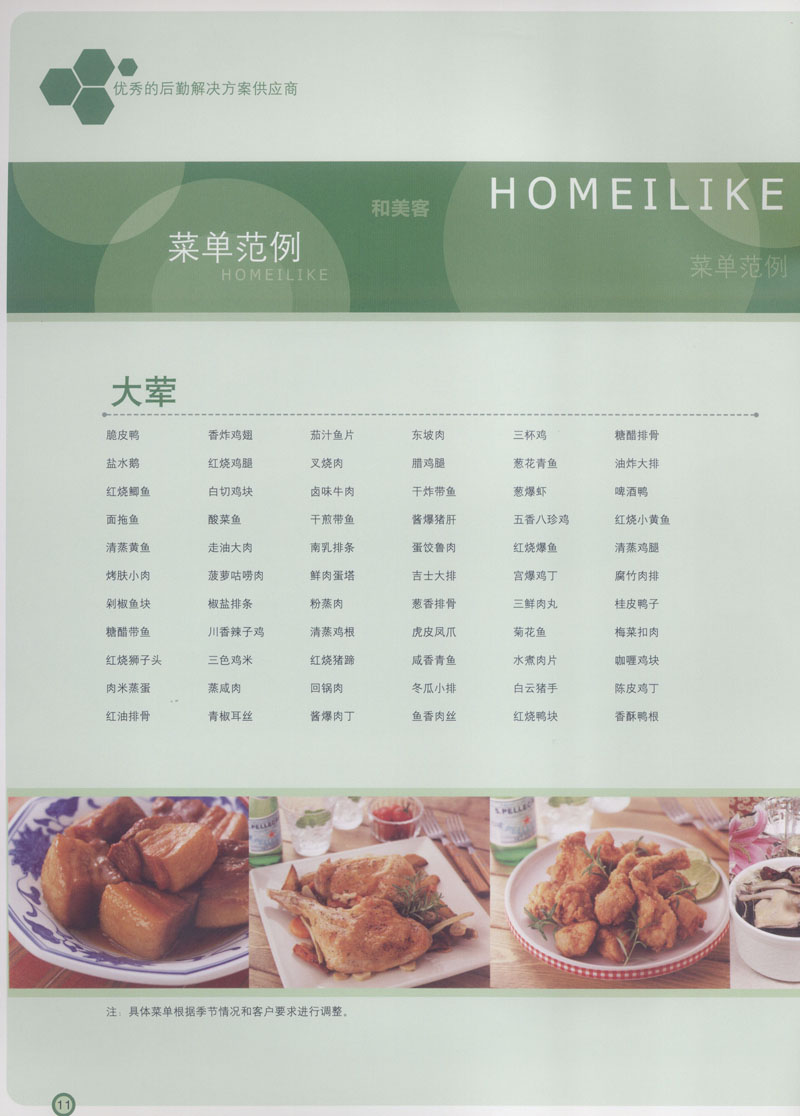 常州市思味特餐飲有限公司是一家專業(yè)從事企事業(yè)后勤服務(wù)的有限責(zé)任公司,公司從承包食堂起步,逐漸發(fā)展為經(jīng)營團膳承包、營養(yǎng)送餐、生活區(qū)管理、連鎖餐廳的綜合型企業(yè)。2008年公司斥資100萬元,在常州興建了可以同時提供3000餐膳食的中央廚房,重點打造“和美客”后勤服務(wù)品牌,全力為企事業(yè)單位解決后勤后顧之憂。 到目前為止,我們合作成功的企事業(yè)單位超過50多家,服務(wù)人數(shù)突破15萬,合作單位包括國家機關(guān)、國有企業(yè)、三資企業(yè)、民營企業(yè)、學(xué)校、醫(yī)院等,其中不乏國際知名品牌公司。 和美客愿為更多的國內(nèi)外企事業(yè)單位及機關(guān)團體分憂解難,從廚房設(shè)計、菜品配送、團膳承包、到生活區(qū)管理等提供全方位的服務(wù)。