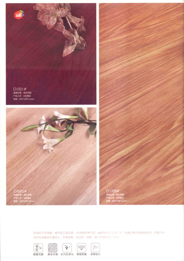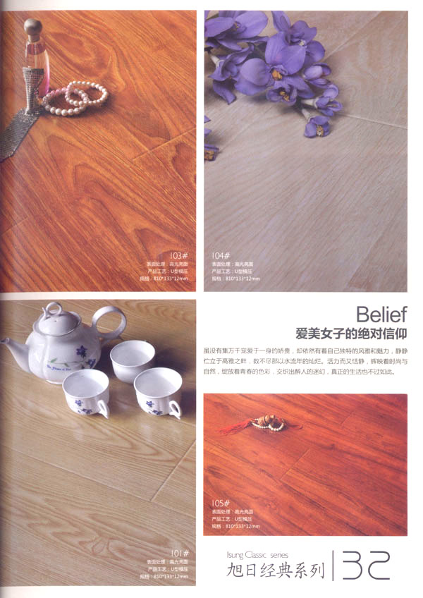 品牌保證,質(zhì)量放心 公司旗下“霞光.旭日”品牌地板系列由旭日皇家、旭日經(jīng)典、旭日戀家、至尊奢華、巧奪天工、水晶陶瓷等幾個(gè)系列構(gòu)成,配有專職質(zhì)量檢驗(yàn)人員,嚴(yán)把產(chǎn)品質(zhì)量關(guān),不斷完善產(chǎn)品質(zhì)量體系、監(jiān)控管理體系。公司對(duì)客戶需求全面、科學(xué)、準(zhǔn)確地把握,確保對(duì)客戶市場(chǎng)適時(shí)高效反應(yīng)。一流的設(shè)備、精心的選材、完美的工藝以及對(duì)產(chǎn)品品味不倦的追求,令奔公司產(chǎn)品獨(dú)樹一幟。