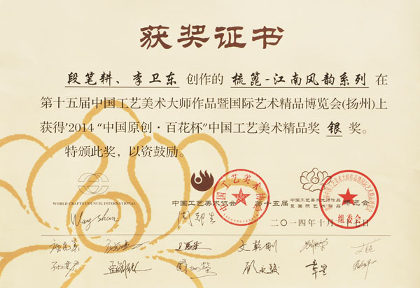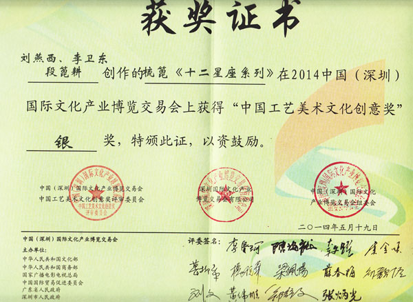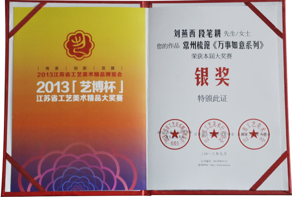 公司榮譽(yù)介紹: “2009年常州市旅游商品創(chuàng)新設(shè)計(jì)大賽”,“覽盡千荷”綠檀雕刻梳榮獲三等獎(jiǎng); “2011年常州市旅游商品創(chuàng)新設(shè)計(jì)大賽”,“彩印工藝梳-我們的年代(80)”榮獲二等獎(jiǎng)。 “2011年中國(guó)包裝創(chuàng)意設(shè)計(jì)大賽“,虞美人彩印梳篦系列包裝獲得一等獎(jiǎng); “2011年中國(guó)包裝創(chuàng)意設(shè)計(jì)大賽”,虞美人筷子系列包裝獲得三等獎(jiǎng); “2011創(chuàng)意中國(guó).第五屆設(shè)計(jì)藝術(shù)大獎(jiǎng)賽”,虞美人系列包裝獲得三等獎(jiǎng); “2011首屆中國(guó)(無(wú)錫)國(guó)際文化藝術(shù)博覽會(huì)”,漆藝對(duì)梳《喜玫瑰》獲得“藝博杯“銅獎(jiǎng)。 “第十三屆中國(guó)工藝美術(shù)大師作品暨國(guó)際藝術(shù)精品博覽會(huì)”, 漆藝梳《報(bào)喜鳥》榮獲2012“儒士儒家•百花杯”中國(guó)工藝美術(shù)精品獎(jiǎng)優(yōu)秀獎(jiǎng) “第十三屆中國(guó)工藝美術(shù)大師作品暨國(guó)際藝術(shù)精品博覽會(huì)”, 虞美人《渾然天成》榮獲2012“儒士儒家•百花杯”中國(guó)工藝美術(shù)精品獎(jiǎng)金獎(jiǎng) “2012江蘇省工藝美術(shù)精品大獎(jiǎng)賽”,虞美人《S型梳》喜獲“藝博杯”銀獎(jiǎng) “第十四屆中國(guó)工藝美術(shù)大師作品暨國(guó)際藝術(shù)精品博覽會(huì)”, 虞美人工藝梳《新型十二星座梳》榮獲2013“國(guó)信•百花杯”中國(guó)工藝美術(shù)精品獎(jiǎng)優(yōu)秀獎(jiǎng) “2013【藝博杯】江蘇省工藝美術(shù)精品大獎(jiǎng)賽”,虞美人《萬(wàn)事如意系列》喜獲“藝博杯”銀獎(jiǎng) “2013江蘇省工藝美術(shù)新人新作成果展作品大獎(jiǎng)賽”,虞美人《壺(福)的藝術(shù)》喜獲“藝博杯”入圍獎(jiǎng) 2013年度江蘇省“蘇商領(lǐng)袖峰會(huì)”,常州市卓尚飾品有限公司榮獲最具成長(zhǎng)性企業(yè)獎(jiǎng) 常州市卓尚飾品(虞美人)有限公司總經(jīng)理李衛(wèi)東榮獲“常州創(chuàng)意產(chǎn)業(yè)協(xié)會(huì)2013年底慈善獎(jiǎng)榮譽(yù)” 常州市卓尚飾品有限公司榮獲薛家鎮(zhèn)人民政府2013年度“創(chuàng)新創(chuàng)優(yōu)”獎(jiǎng) 常州市卓尚飾品有限公司榮獲薛家鎮(zhèn)人民政府2013年度“銷售業(yè)績(jī)”獎(jiǎng) 2014中國(guó)(深圳)國(guó)際文化產(chǎn)業(yè)博覽交易會(huì),劉燕西、李衛(wèi)東、段筆耕<十二星座系列>獲得“中國(guó)工藝美術(shù)文化創(chuàng)意獎(jiǎng)”銀獎(jiǎng) 2014中國(guó)(深圳)國(guó)際文化產(chǎn)業(yè)博覽交易會(huì),徐德鴻、李衛(wèi)東、段筆耕《漆彩人生系列》獲得“中國(guó)工藝美術(shù)文化創(chuàng)意獎(jiǎng)”銅獎(jiǎng) 文化創(chuàng)意大獎(jiǎng)賽“紫金獎(jiǎng)” ,有余(魚)系列梳篦產(chǎn)品獲得了優(yōu)秀獎(jiǎng) 2014吟飛杯首屆常州文化創(chuàng)意和設(shè)計(jì)大賽,虞美人有余(魚)系列梳篦產(chǎn)品榮獲優(yōu)秀設(shè)計(jì)獎(jiǎng) 2014吟飛杯首屆常州文化創(chuàng)意和設(shè)計(jì)大賽,虞美人“云,月”系列梳篦產(chǎn)品榮獲優(yōu)秀設(shè)計(jì)獎(jiǎng) 2014藝博杯江蘇省工藝美術(shù)精品大獎(jiǎng)賽,虞美人《梳篦:酒醉的探戈》喜獲銀獎(jiǎng) 2014“中國(guó)原創(chuàng)•百花杯”中國(guó)工藝美術(shù)精品大獎(jiǎng)賽,虞美人《梳篦-江南風(fēng)韻系列》喜獲銀獎(jiǎng) 常州市卓尚飾品有限公司獲“2014年常州市電子商務(wù)協(xié)會(huì)2014年度優(yōu)秀會(huì)員單位” 2014“虞美人”成為常州市知名商標(biāo)。