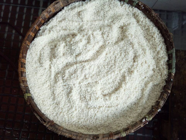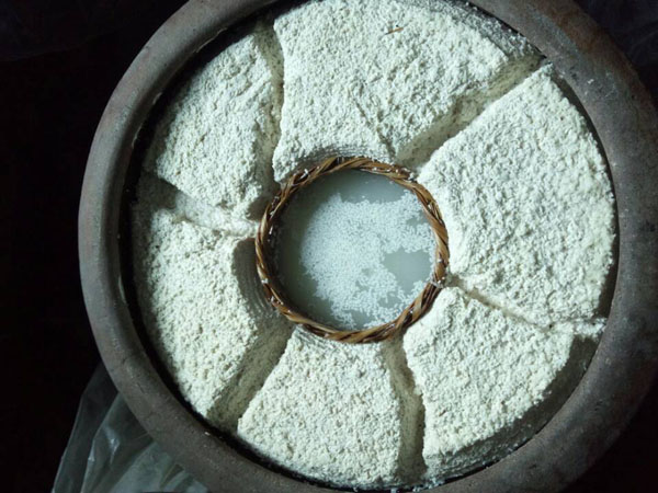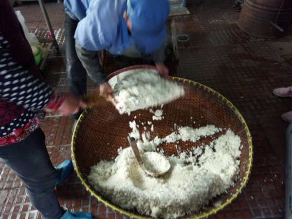 第三步:拌入酒曲,這時(shí)候才發(fā)現(xiàn)了“木桶”的神奇之處:一頭空,另一頭也是空,只不過(guò)用鋼筋做了個(gè)柵欄。之前蒸米飯,老徐是墊上了蒲草,一方面讓糯米飯更易熟,另一方面也增加了糯米飯的清香氣息。把糯米飯倒入蠶匾中,邊翻動(dòng)糯米飯邊撒上酒曲,使酒曲與糯米飯充分拌勻。