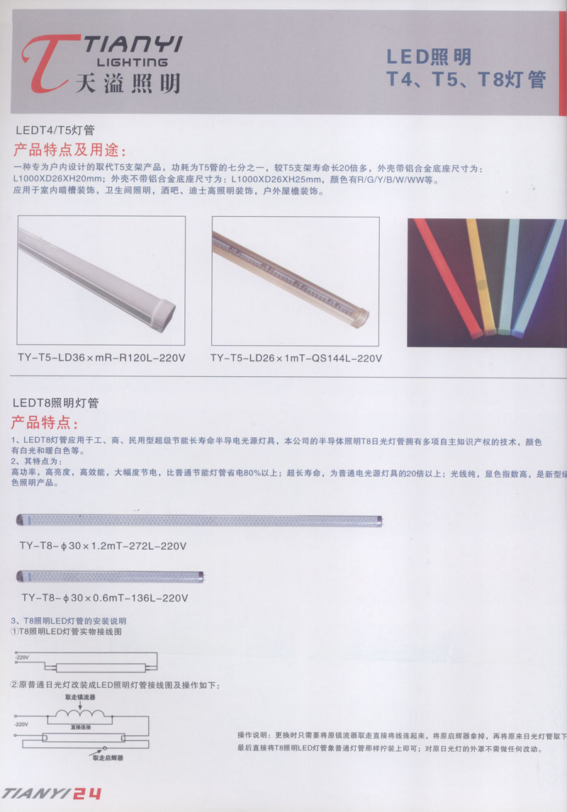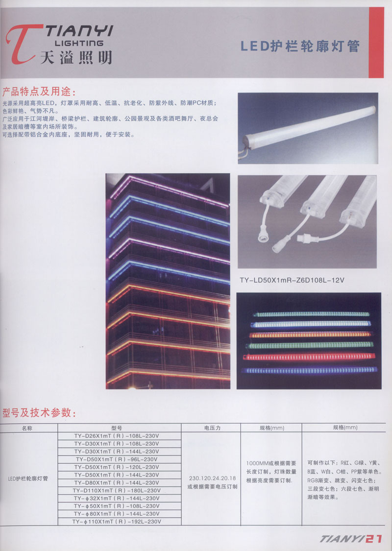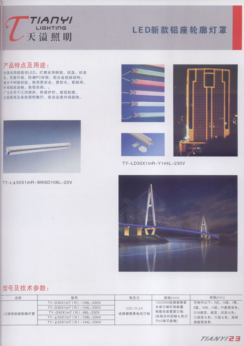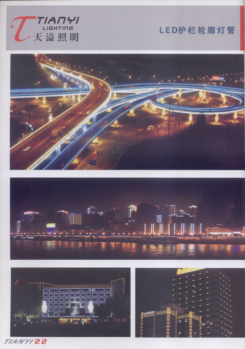 天溢照明是中國(guó)領(lǐng)先的專(zhuān)業(yè)從事LED廣告照明裝飾燈具設(shè)計(jì)、系統(tǒng)開(kāi)發(fā)、燈具制造、工程服務(wù)一體的專(zhuān)業(yè)型公司,本公司產(chǎn)品已廣泛應(yīng)用于全國(guó)大多數(shù)城市夜景亮化景觀(guān)照明、酒店休閑娛樂(lè)夜場(chǎng)夢(mèng)幻燈光、戶(hù)內(nèi)外廣告宣傳、建筑及室內(nèi)照明以及家居裝飾等場(chǎng)合。 本公司產(chǎn)品涵蓋景觀(guān)裝飾照明、商用照明、居家照明、信息廣告顯示等領(lǐng)域,我們將性能可靠與適中價(jià)格的LED全系列產(chǎn)品帶到世界各個(gè)、角落。
