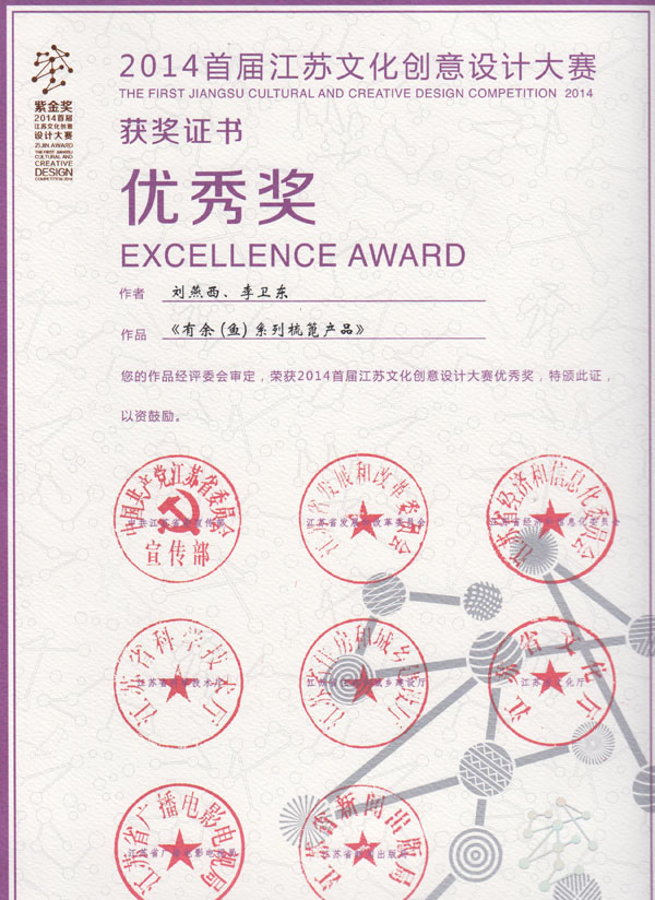 公司榮譽(yù)介紹: “2009年常州市旅游商品創(chuàng)新設(shè)計大賽”,“覽盡千荷”綠檀雕刻梳榮獲三等獎; “2011年常州市旅游商品創(chuàng)新設(shè)計大賽”,“彩印工藝梳-我們的年代(80)”榮獲二等獎。 “2011年中國包裝創(chuàng)意設(shè)計大賽“,虞美人彩印梳篦系列包裝獲得一等獎; “2011年中國包裝創(chuàng)意設(shè)計大賽”,虞美人筷子系列包裝獲得三等獎; “2011創(chuàng)意中國.第五屆設(shè)計藝術(shù)大獎賽”,虞美人系列包裝獲得三等獎; “2011首屆中國(無錫)國際文化藝術(shù)博覽會”,漆藝對梳《喜玫瑰》獲得“藝博杯“銅獎。 “第十三屆中國工藝美術(shù)大師作品暨國際藝術(shù)精品博覽會”, 漆藝梳《報喜鳥》榮獲2012“儒士儒家•百花杯”中國工藝美術(shù)精品獎優(yōu)秀獎 “第十三屆中國工藝美術(shù)大師作品暨國際藝術(shù)精品博覽會”, 虞美人《渾然天成》榮獲2012“儒士儒家•百花杯”中國工藝美術(shù)精品獎金獎 “2012江蘇省工藝美術(shù)精品大獎賽”,虞美人《S型梳》喜獲“藝博杯”銀獎 “第十四屆中國工藝美術(shù)大師作品暨國際藝術(shù)精品博覽會”, 虞美人工藝梳《新型十二星座梳》榮獲2013“國信•百花杯”中國工藝美術(shù)精品獎優(yōu)秀獎 “2013【藝博杯】江蘇省工藝美術(shù)精品大獎賽”,虞美人《萬事如意系列》喜獲“藝博杯”銀獎 “2013江蘇省工藝美術(shù)新人新作成果展作品大獎賽”,虞美人《壺(福)的藝術(shù)》喜獲“藝博杯”入圍獎 2013年度江蘇省“蘇商領(lǐng)袖峰會”,常州市卓尚飾品有限公司榮獲最具成長性企業(yè)獎 常州市卓尚飾品(虞美人)有限公司總經(jīng)理李衛(wèi)東榮獲“常州創(chuàng)意產(chǎn)業(yè)協(xié)會2013年底慈善獎榮譽(yù)” 常州市卓尚飾品有限公司榮獲薛家鎮(zhèn)人民政府2013年度“創(chuàng)新創(chuàng)優(yōu)”獎 常州市卓尚飾品有限公司榮獲薛家鎮(zhèn)人民政府2013年度“銷售業(yè)績”獎 2014中國(深圳)國際文化產(chǎn)業(yè)博覽交易會,劉燕西、李衛(wèi)東、段筆耕<十二星座系列>獲得“中國工藝美術(shù)文化創(chuàng)意獎”銀獎 2014中國(深圳)國際文化產(chǎn)業(yè)博覽交易會,徐德鴻、李衛(wèi)東、段筆耕《漆彩人生系列》獲得“中國工藝美術(shù)文化創(chuàng)意獎”銅獎 文化創(chuàng)意大獎賽“紫金獎” ,有余(魚)系列梳篦產(chǎn)品獲得了優(yōu)秀獎 2014吟飛杯首屆常州文化創(chuàng)意和設(shè)計大賽,虞美人有余(魚)系列梳篦產(chǎn)品榮獲優(yōu)秀設(shè)計獎 2014吟飛杯首屆常州文化創(chuàng)意和設(shè)計大賽,虞美人“云,月”系列梳篦產(chǎn)品榮獲優(yōu)秀設(shè)計獎 2014藝博杯江蘇省工藝美術(shù)精品大獎賽,虞美人《梳篦:酒醉的探戈》喜獲銀獎 2014“中國原創(chuàng)•百花杯”中國工藝美術(shù)精品大獎賽,虞美人《梳篦-江南風(fēng)韻系列》喜獲銀獎 常州市卓尚飾品有限公司獲“2014年常州市電子商務(wù)協(xié)會2014年度優(yōu)秀會員單位” 2014“虞美人”成為常州市知名商標(biāo)。