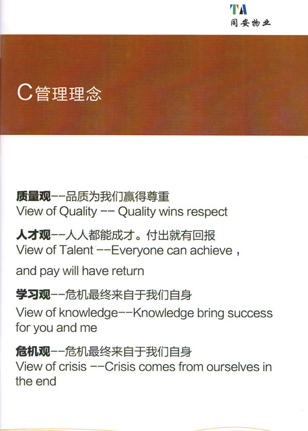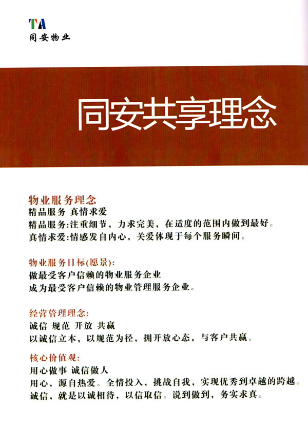 公司始終以“打造中國最值得信賴和最值得尊重的物業(yè)管理服務(wù)集成商”為愿景自我鞭策,不斷前行。同安物業(yè)以客戶滿意為終極目標,不斷加強”崗位資格認證能力,人才招聘與職業(yè)化培訓(xùn)能力,產(chǎn)品策劃與管理設(shè)計能力,品質(zhì)監(jiān)督與管控能力,技術(shù)更新與運營優(yōu)化力“五大專業(yè)能力的培養(yǎng)和提升,實現(xiàn)“精品化管理,專業(yè)化服務(wù)”。