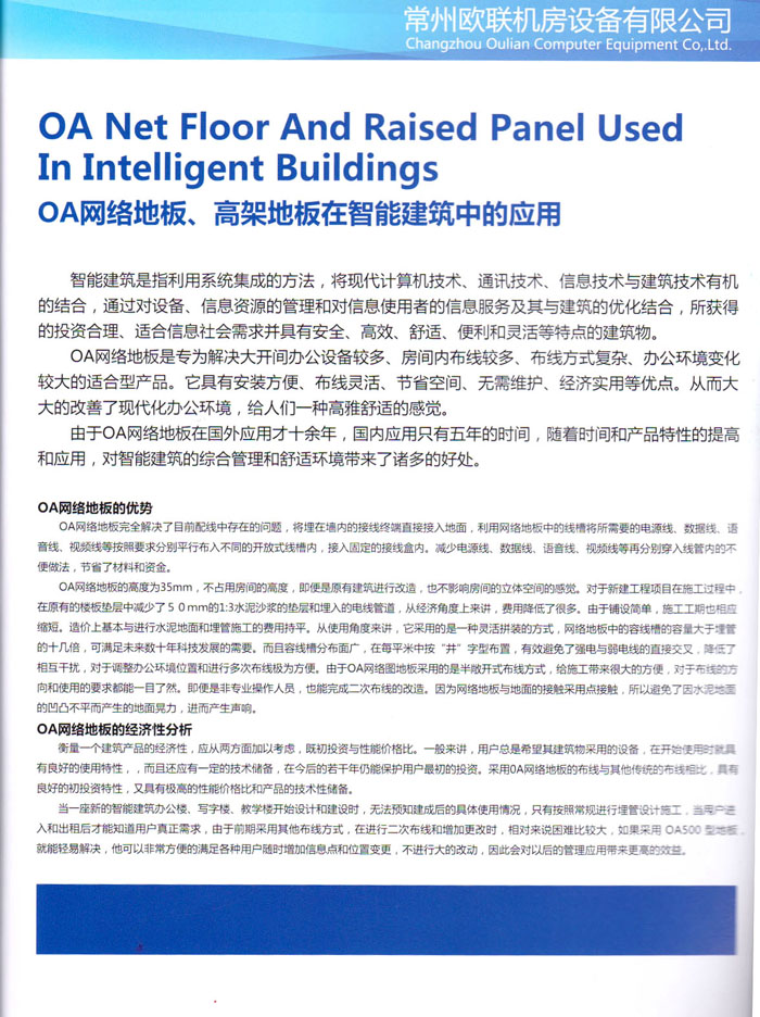 防靜電高架活動(dòng)地板、全鋼地板、陶瓷地板是計(jì)算機(jī)行業(yè)發(fā)展起來的新型鋪地材料,隔離了潮氣、靜電灰塵,最重要的是解決了綜合布線問題,無需預(yù)埋管線,可隨時(shí)拆卸、搬移,保證了資訊設(shè)備完整的優(yōu)點(diǎn),適應(yīng)了智能化樓宇中信息自動(dòng)化技術(shù)對(duì)所處環(huán)境的特定要求,避免了廣大客戶的雙重投資,使現(xiàn)代化辦公程度更加高效,辦公場(chǎng)所更加舒適。 “歐聯(lián)”系列全鋼地板,符合國(guó)家安全要求,種類完備多樣,其中防靜電陶瓷地板、硫酸鈣地板等除具有普通瓷質(zhì)的裝飾和實(shí)用性外,其耐磨、防水、防火功能優(yōu)于其它同類產(chǎn)品,防靜電系列地板,能切合不同客戶的要求,其靈活的配置,深受客戶歡迎,不同材質(zhì)的地板結(jié)構(gòu)使設(shè)計(jì)師的設(shè)計(jì)空間比傳統(tǒng)的更加廣闊自由和善變。 公司大力發(fā)展國(guó)內(nèi)外銷售業(yè)務(wù),多次中標(biāo)國(guó)內(nèi)重點(diǎn)工程 ,例:哈爾濱醫(yī)科大學(xué)、山東大學(xué)、上海普通機(jī)場(chǎng)等。 公司將一如既往開發(fā)和制造一流的產(chǎn)品,愿與廣大有識(shí)之士合作發(fā)展,共創(chuàng)美好未來。